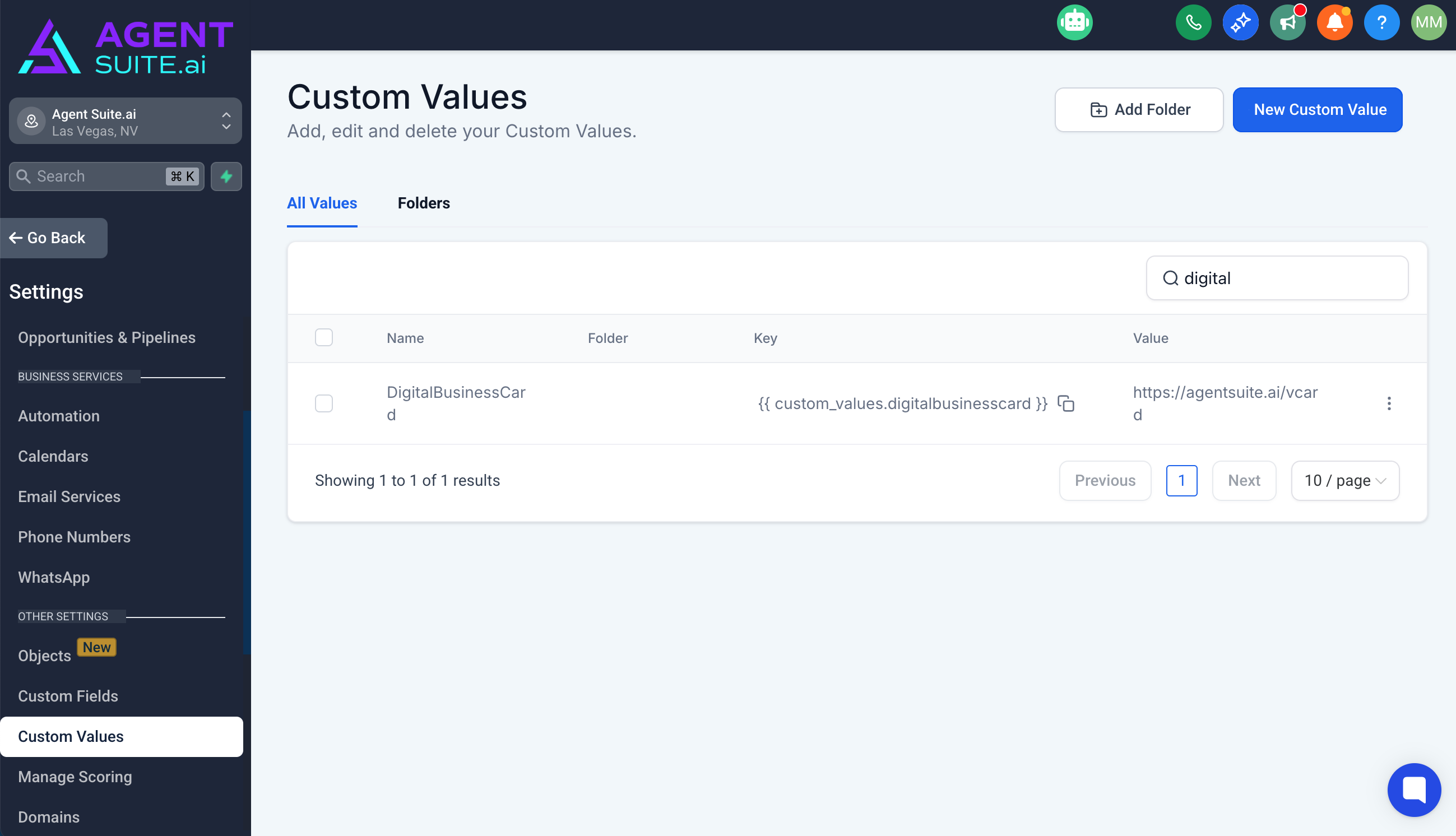In the top right hand corner, you can search for all custom values. Search Digital Business Card and then you can copy the link under Value and bookmark it.