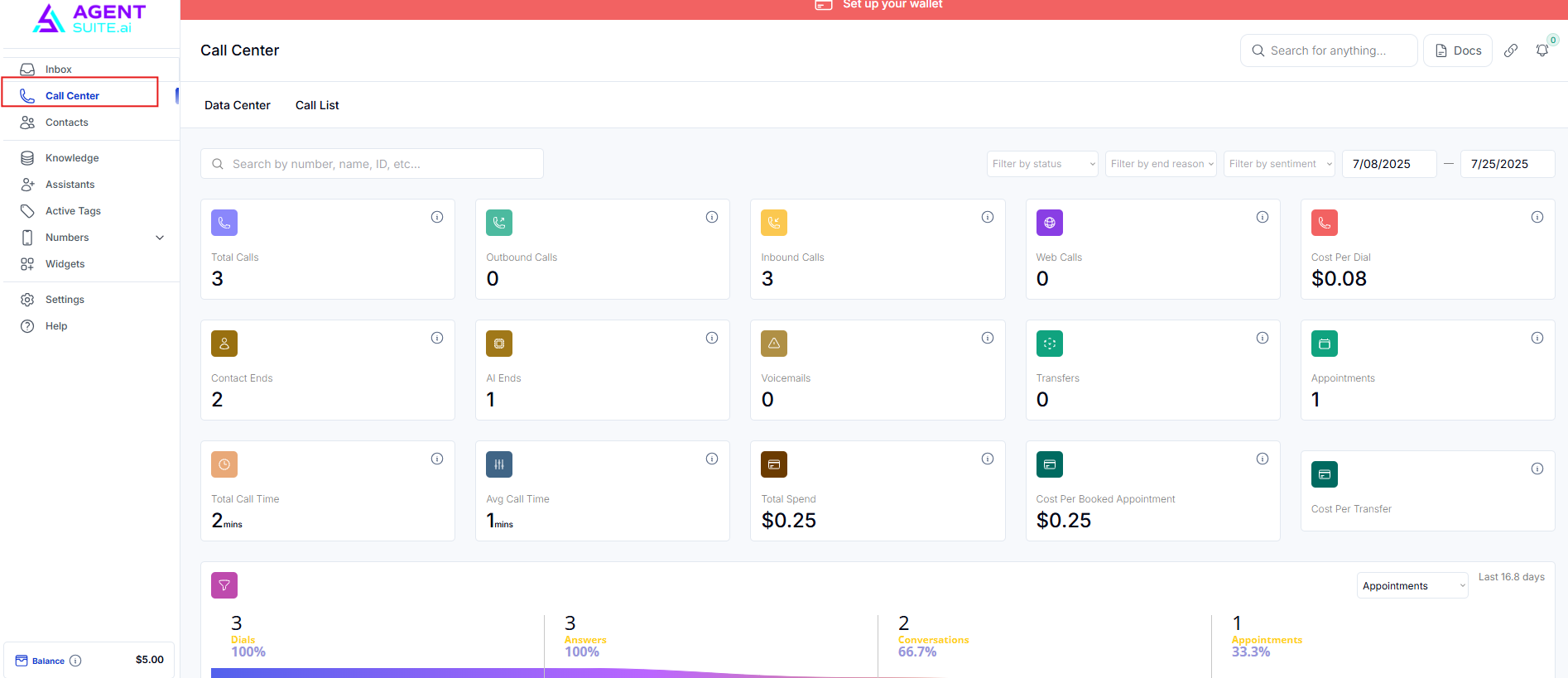 It will take you to a dashboard that summarizes the call activity. This is where you can see how many calls were made, total call charges, how many appointments were booked, etc.