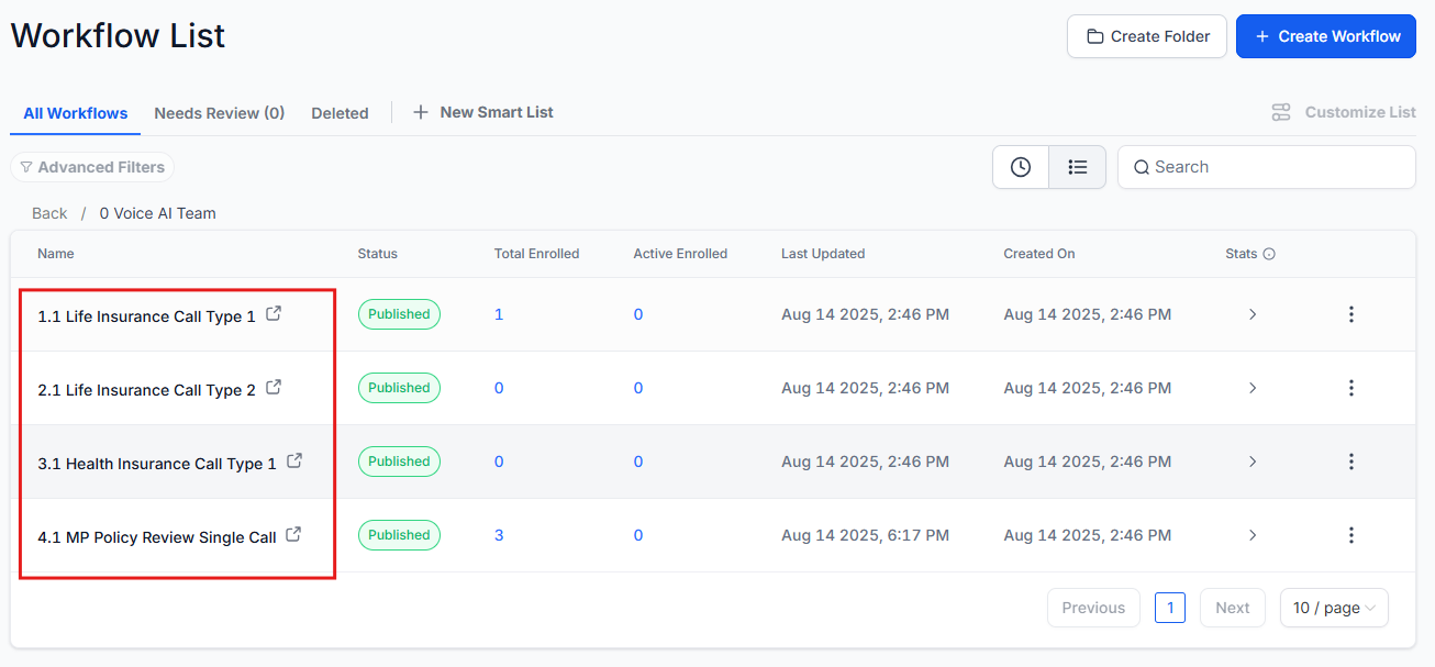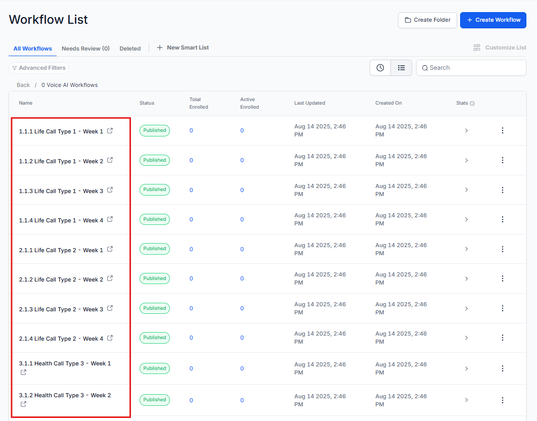 These workflows are the outbound calls handled by the AI. There’s no need to make any changes in this section, as all the necessary tags and settings are already set up in your subaccount.