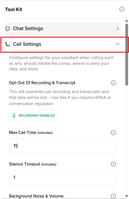 Tool Kit > Call Settings - the configurations are currently set to standard and you shouldn’t need to change any of them. You can also change here the Background Noise and Volume.