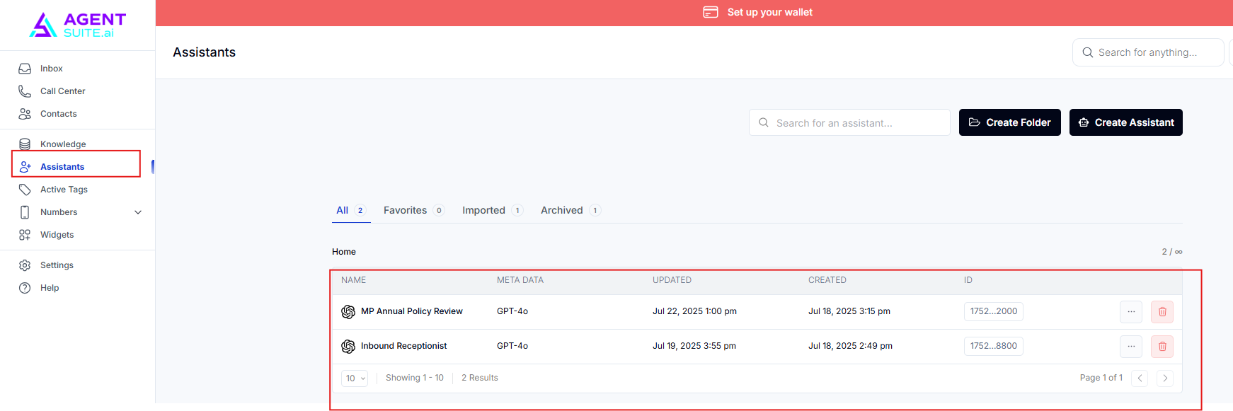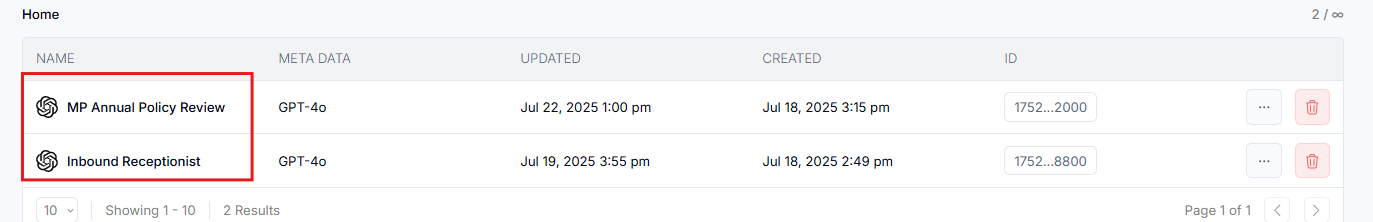 This section shows your active assistants. It’s also where you’ll most often go to configure prompts and adjust all settings related to your Voice AI.