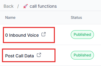 Go to the ‘AI Call Deployment’ > call functions > click the one that says ‘0 Inbound voice’ for Inbound and ‘Post Call Data’ for Outbound