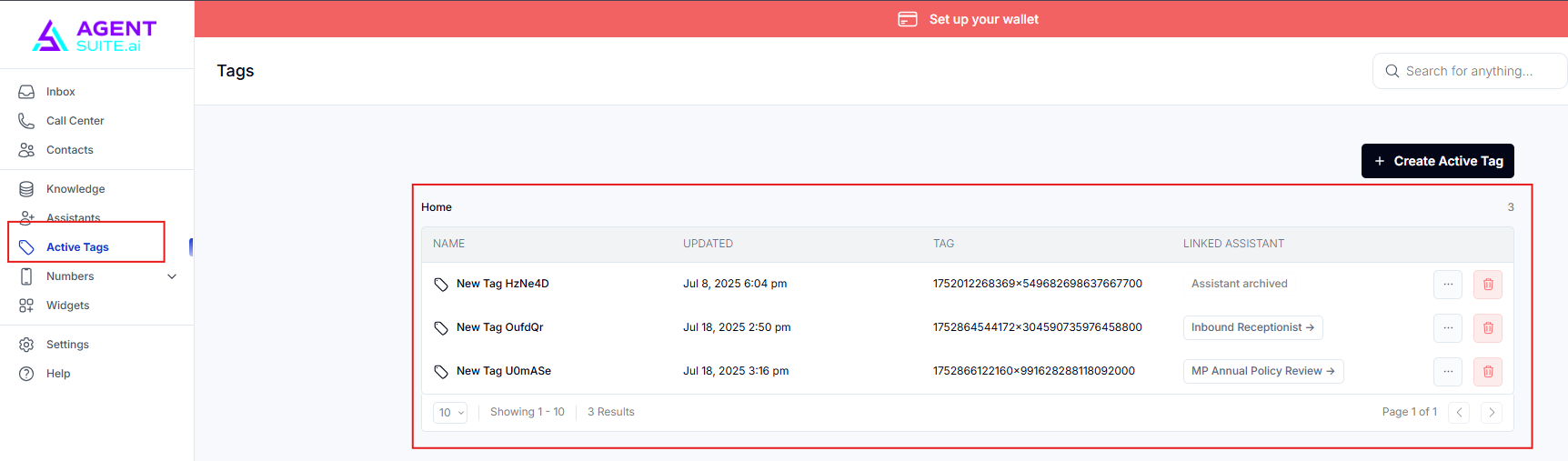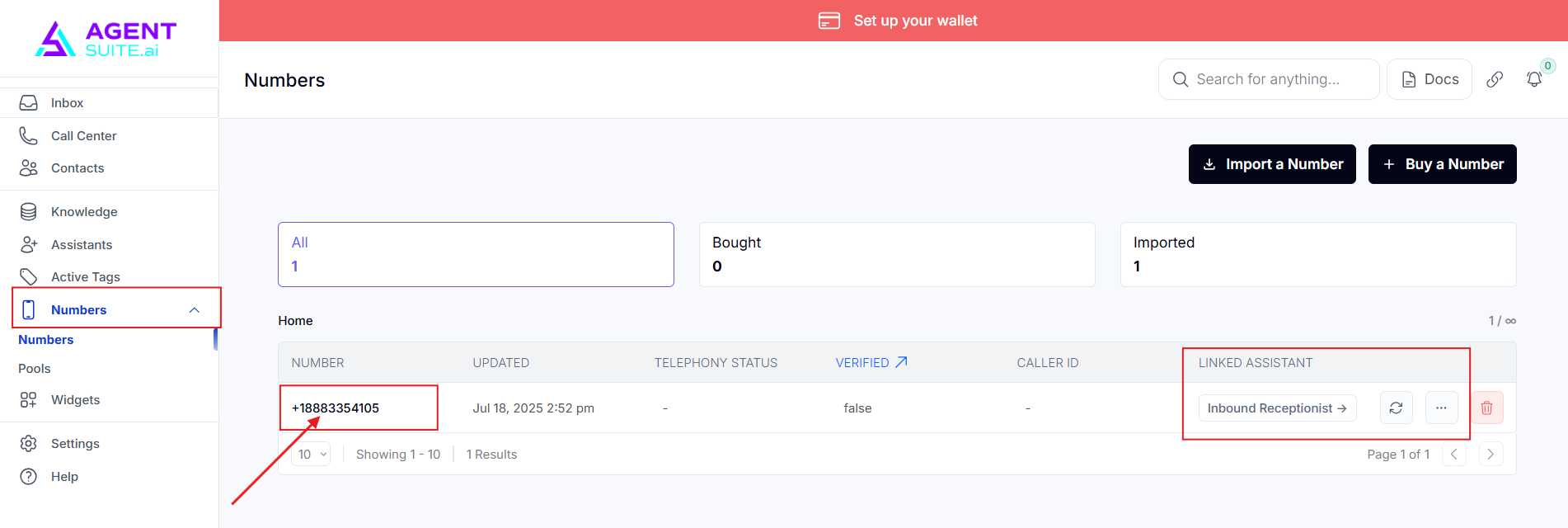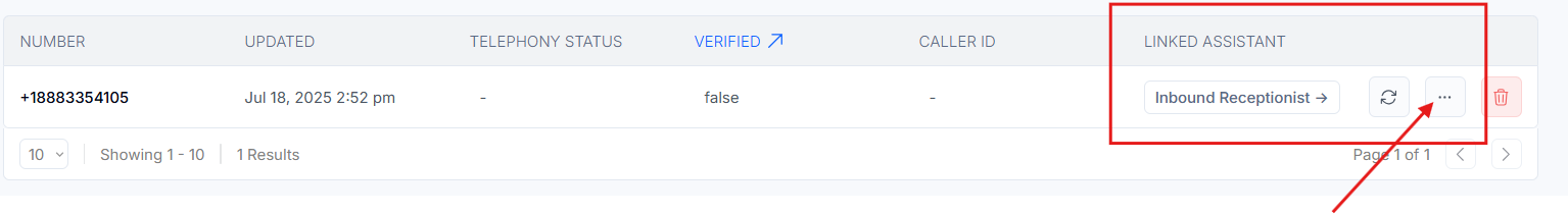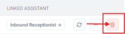 Clicking the trash icon will delete the number. You make sure not to delete it unless necessary. Without a number assigned, the AI won’t be able to make or receive calls.