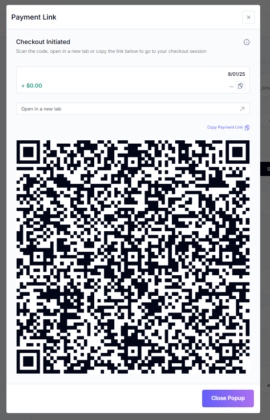 A payment link will pop up, allowing you to connect your card by either clicking 'Open in a new tab' or scanning the QR code to complete the payment.