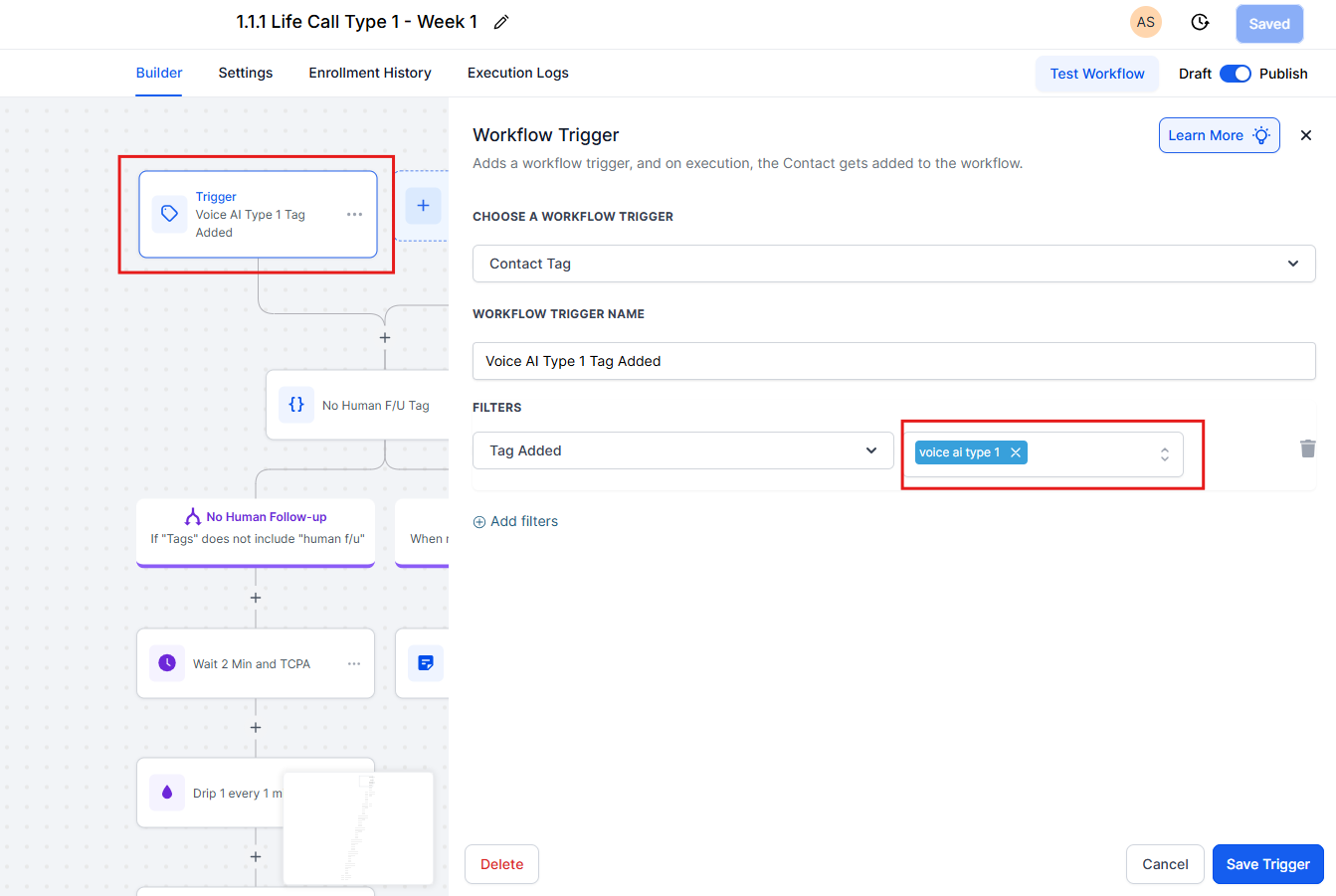 In Life Call Type 1 – Week 1, the trigger tag being used is ‘voice ai type 1.’ You may keep the same tag if you’d like, or update it to whatever you want.