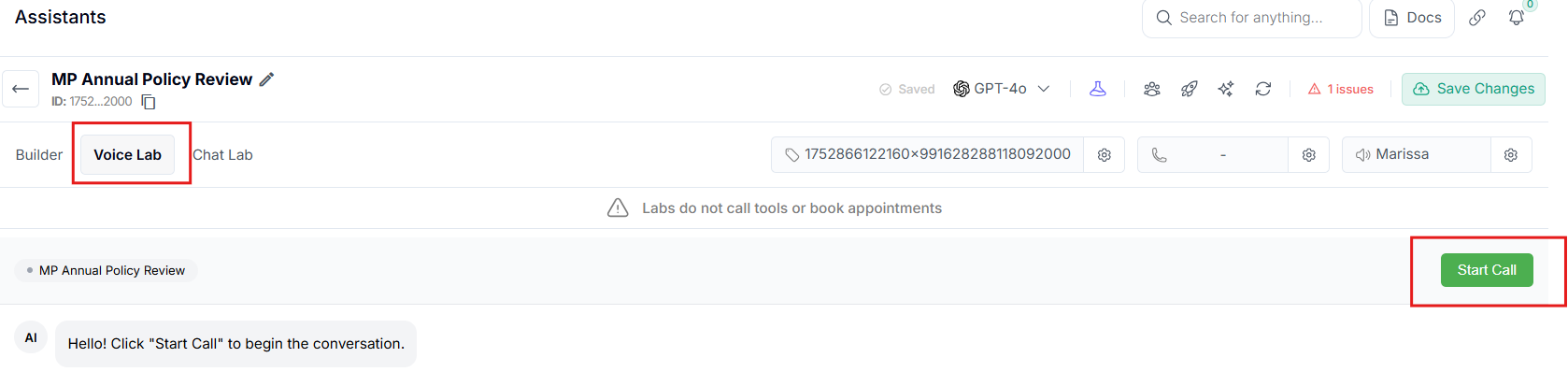 You can click on ‘Voice Lab’ and hit ‘Start Call’. For the ‘Chat Lab’, it won’t book appointments on your calendar and as of this moment, we’re not using chat to test your AI.