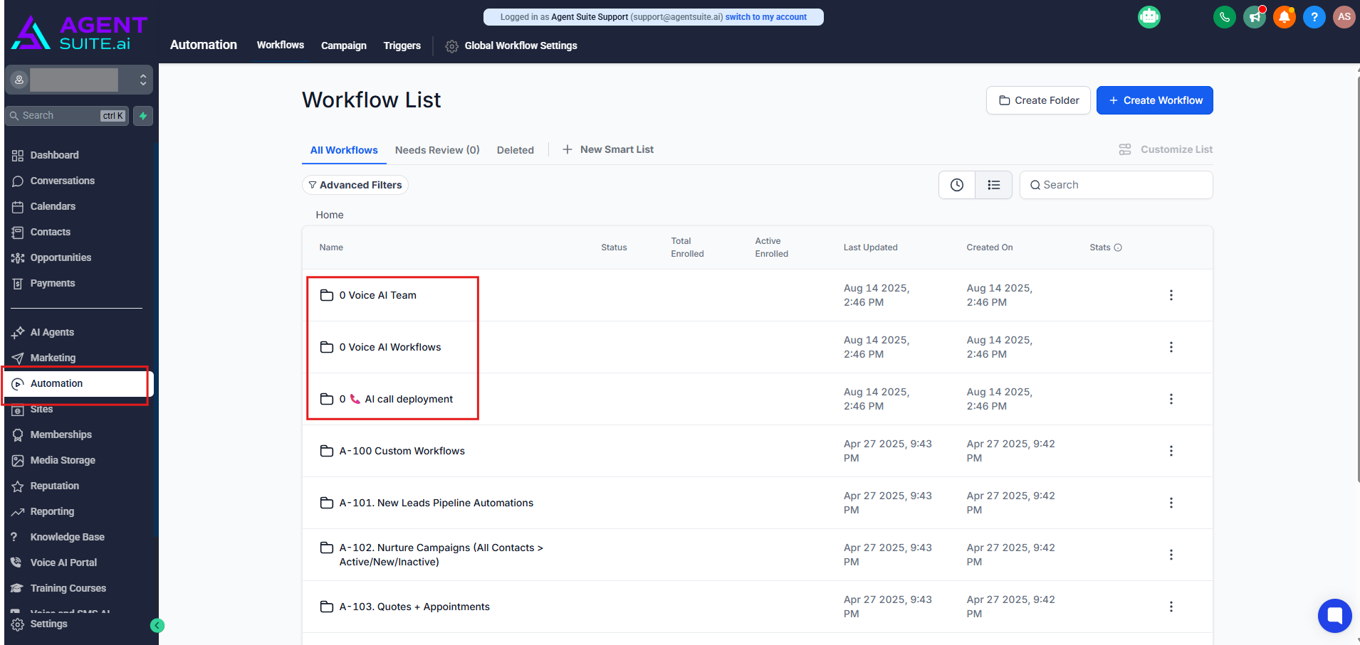 There are three folders assigned for Voice AI: 0 Voice AI Team, 0 Voice AI Workflows, and 0 AI call deployment.