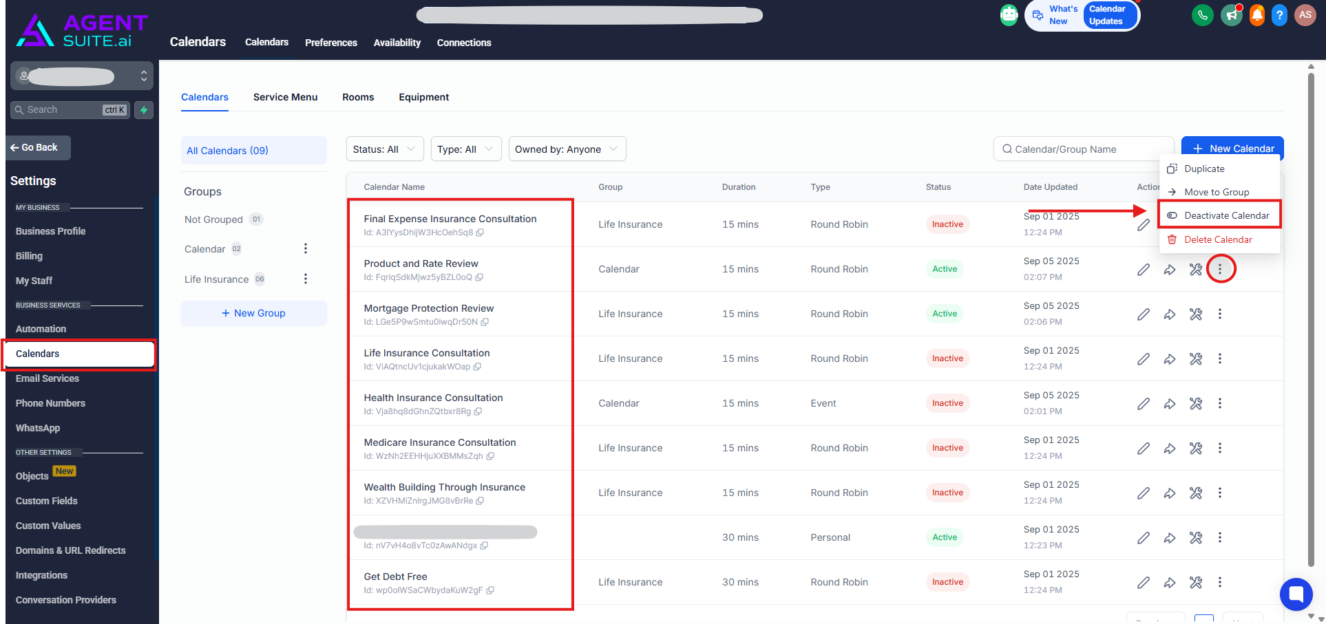 By clicking the three dots next to a calendar, you’ll see additional options such as Duplicate, Move to Group, Deactivate/Activate, and Delete.