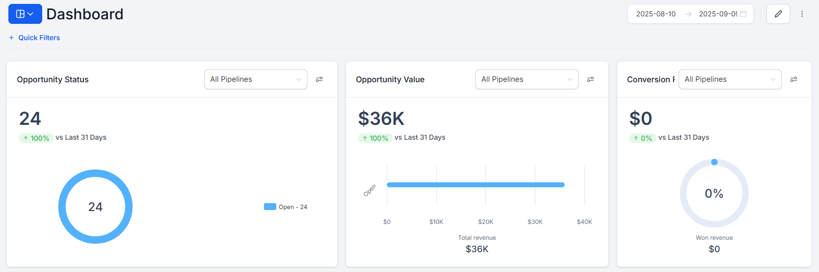 Opened Opportunities: Use this widget to see how many opportunities are currently open. Helpful for real-time tracking.
