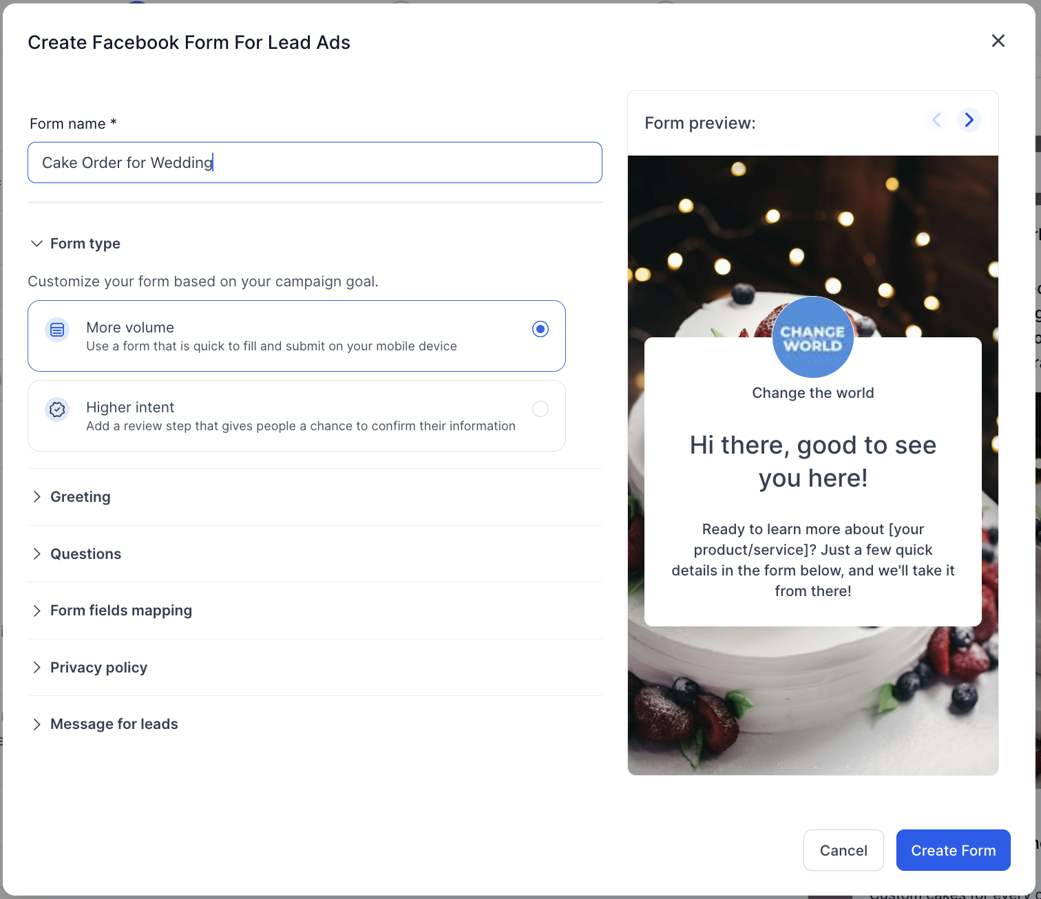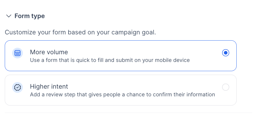 Select the form type option off the two- More Volume and Higher Intent - Difference is that Higher Intent adds a review step to view the information for people to confirm.