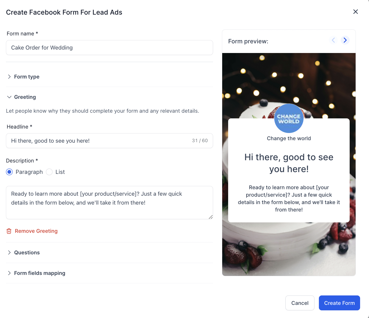 Next step is Greetings to allow the people know why they should complete your form and any relevant details. There are option to add Headline (required field) and add the paragraph or list.