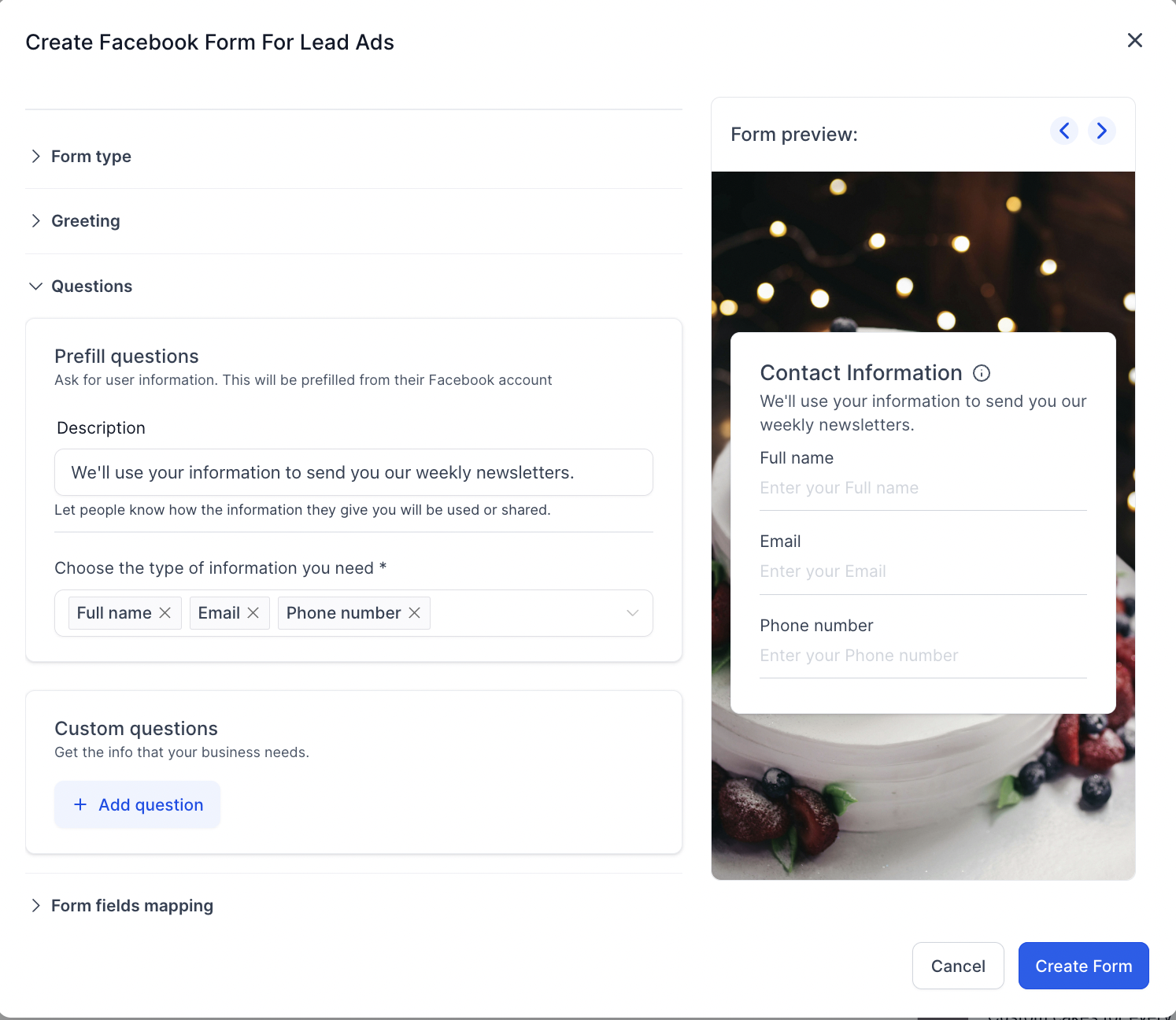 - For custom question, there are option to create short description and multiple choice questions to share the information which is more relevant to your form.