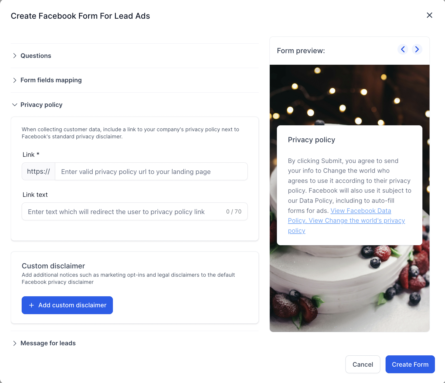 Next form step is adding privacy policy - Add landing page link of your privacy policy of business or you could make a copy of the privacy policy of LeadConnector (https://www.leadconnectorhq.com/privacy-policy).