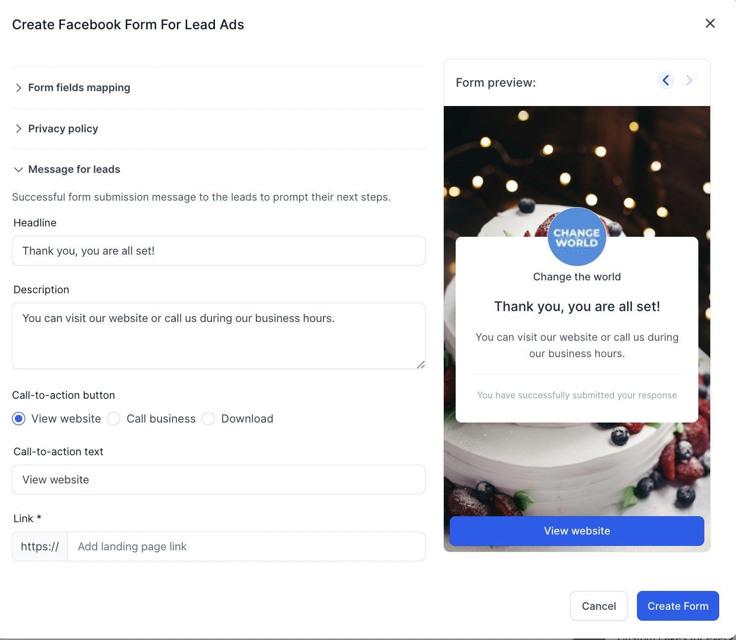 Next step is message for the lead after completing the form, the form provides option to add headline, description, call to action like taking them to a website or call directly.