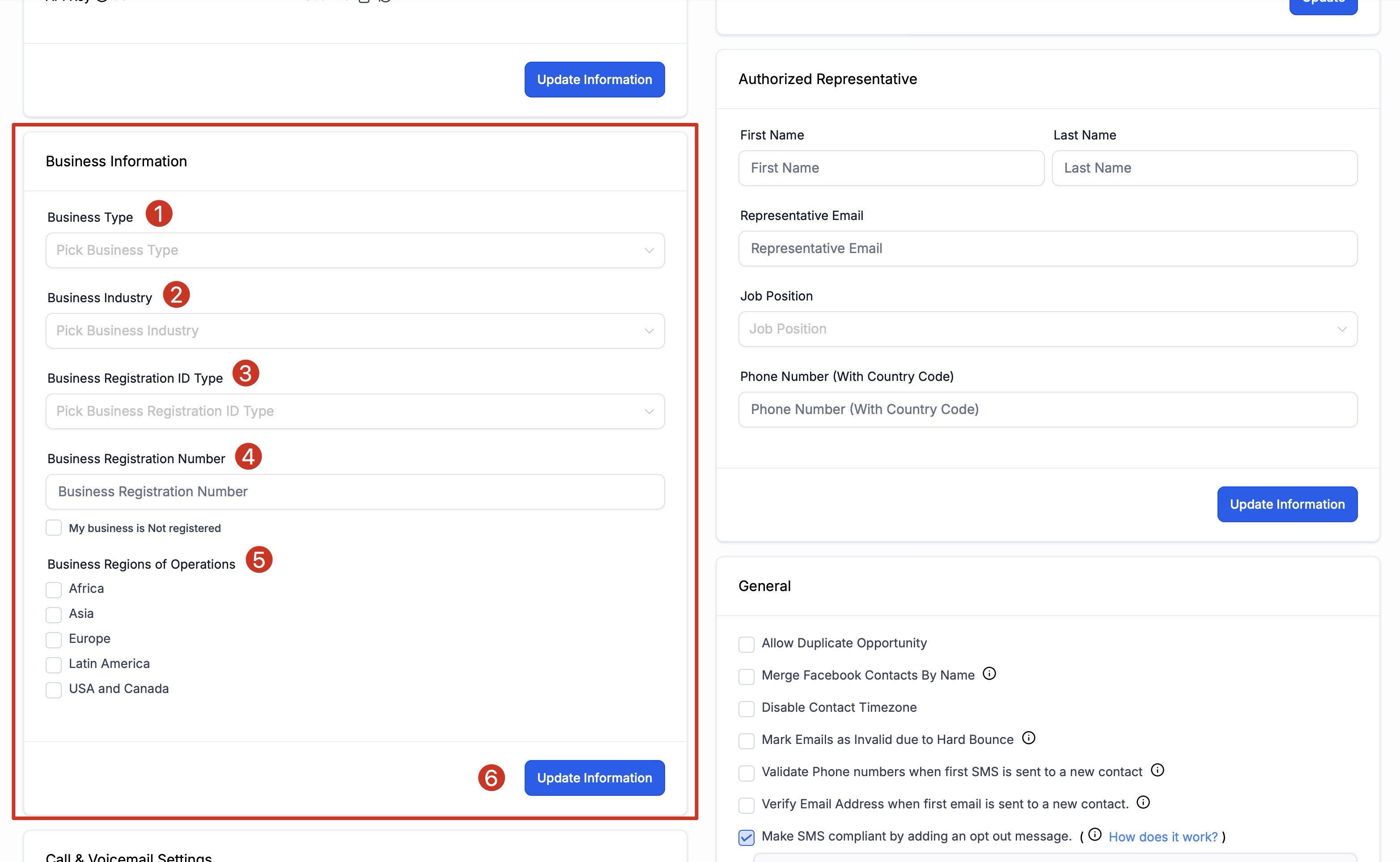 Business Information captures your business type, industry, registration identifiers, and regions of operation. Accurate data here reduces delays in external reviews (e.g., A2P 10DLC) and keeps downstream compliance and reporting consistent.