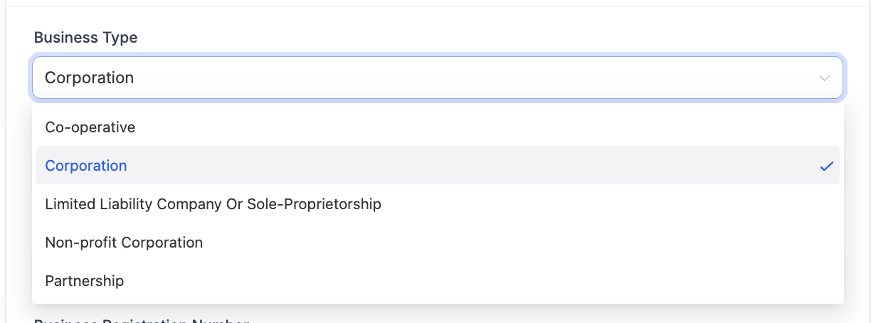 Select the type of business you created. The drop-down will give you the following options to choose from: