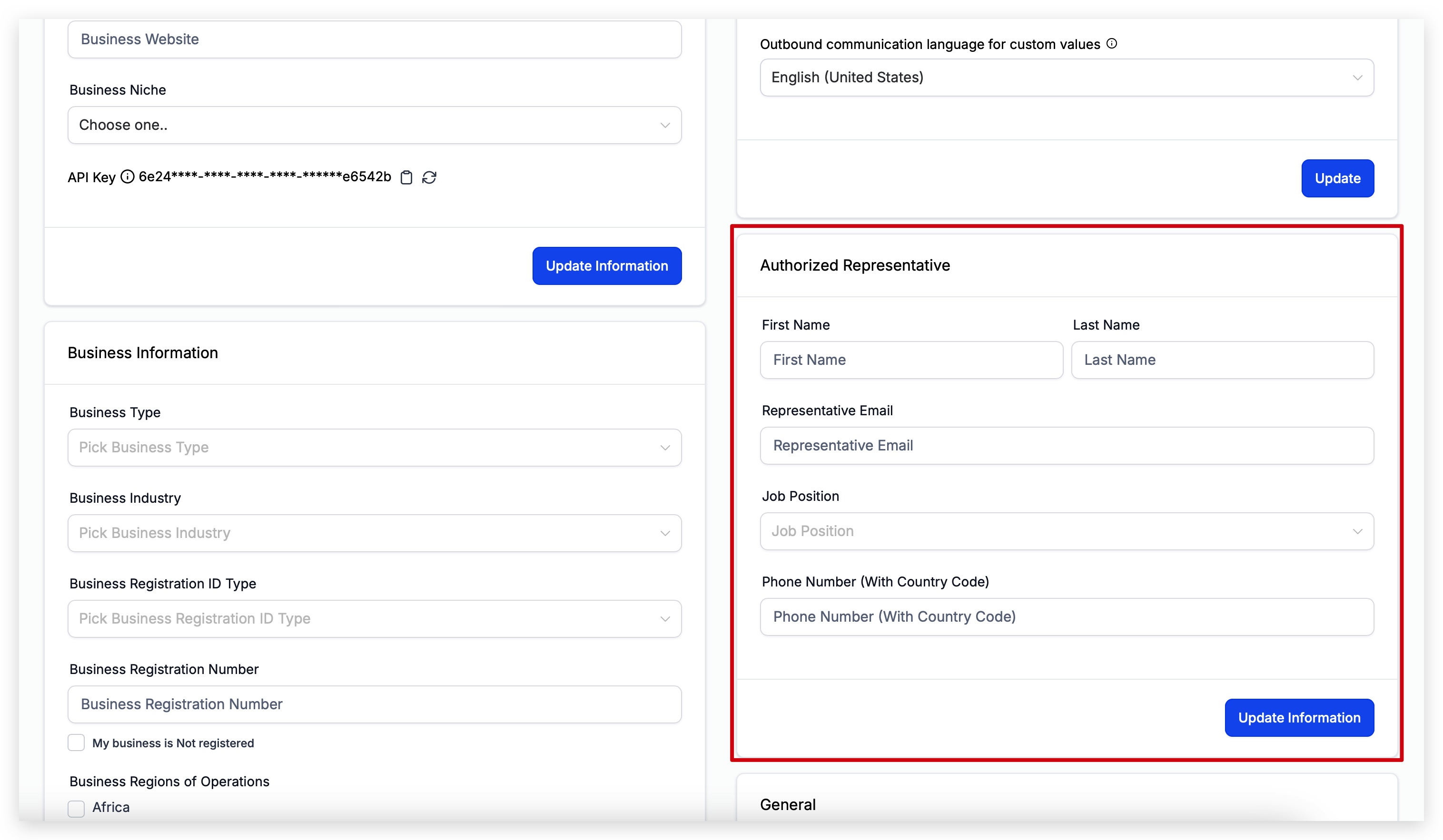 When you’re finished, select the blue Update Information button to apply changes. If the representative changes roles or leaves the company, update this page immediately