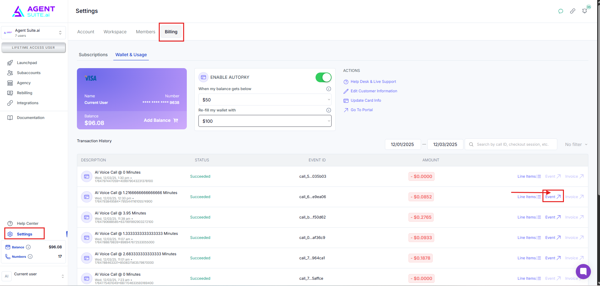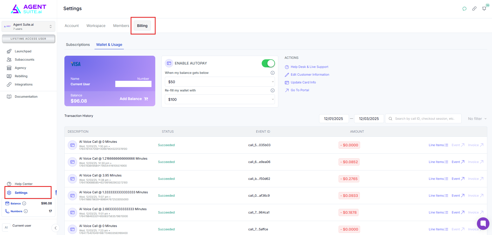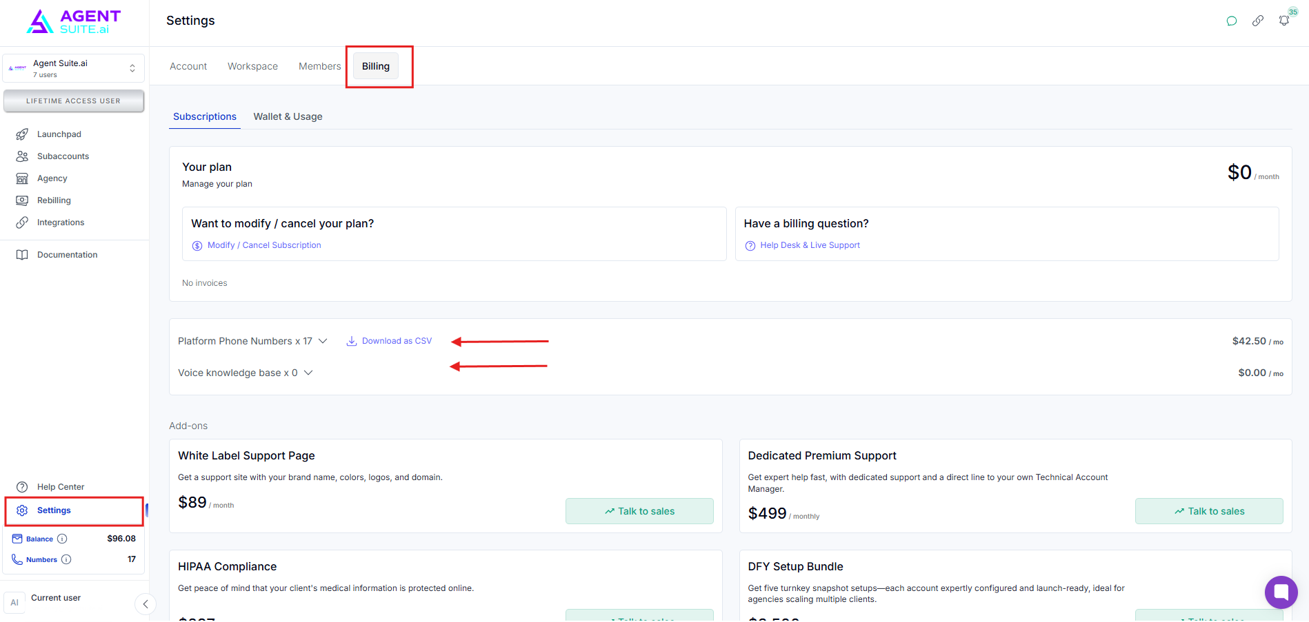 Sub-account actions (like adding phone numbers or voice features) roll up to the main workspace billing.