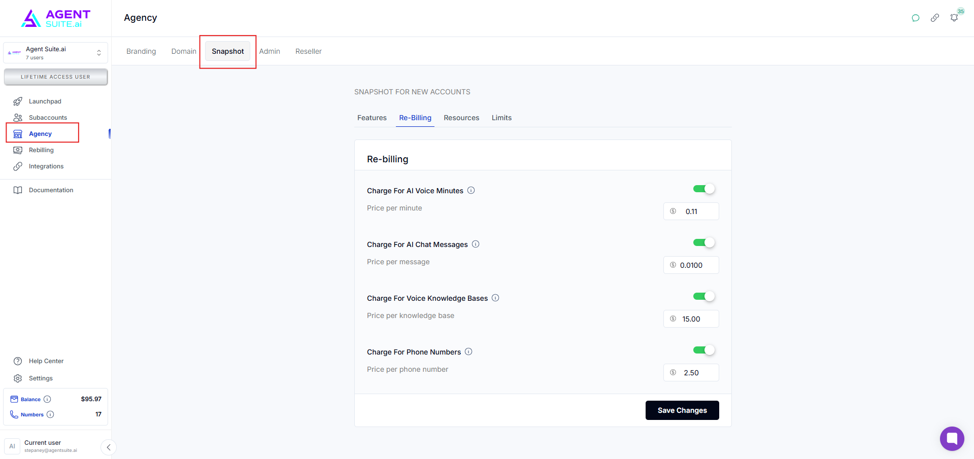 Under New Accounts Have a Snapshot, toggle ON all features you want new sub-accounts to have.