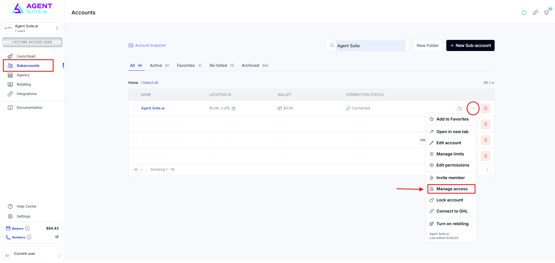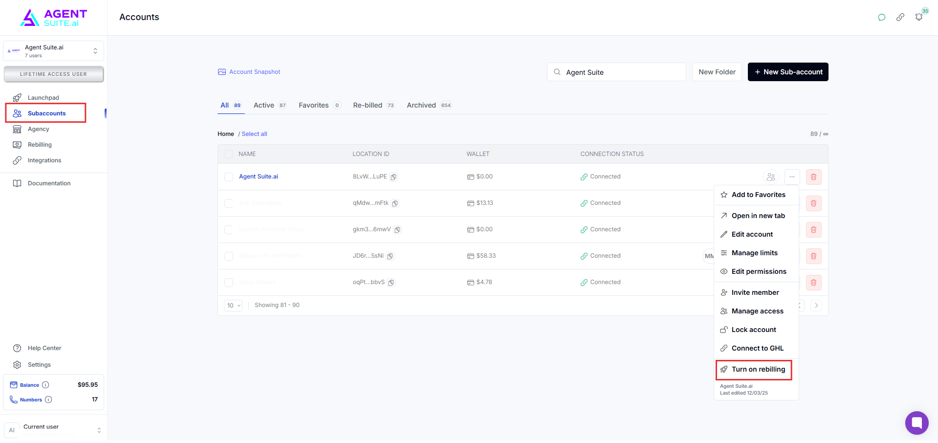 Go to your workspace and navigate to the Subaccount menu. Select the subaccount, click the three dots, and choose 'Turn On Rebilling’.