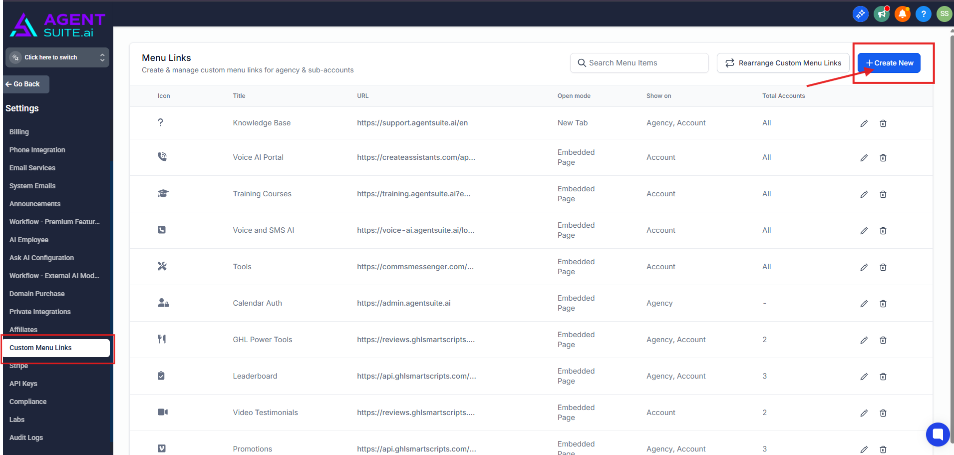 Navigate to Settings in the Agency View of your GoHighLevel account. Click on Custom Menu Links. Then click Create New.