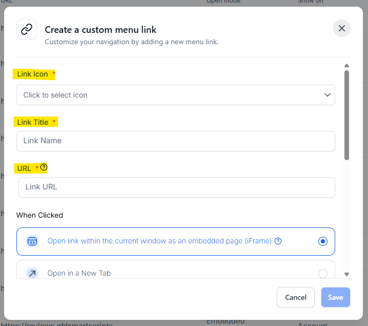 Choose an icon and name for your Custom Menu Link, then paste the Custom Menu Link you copied earlier.