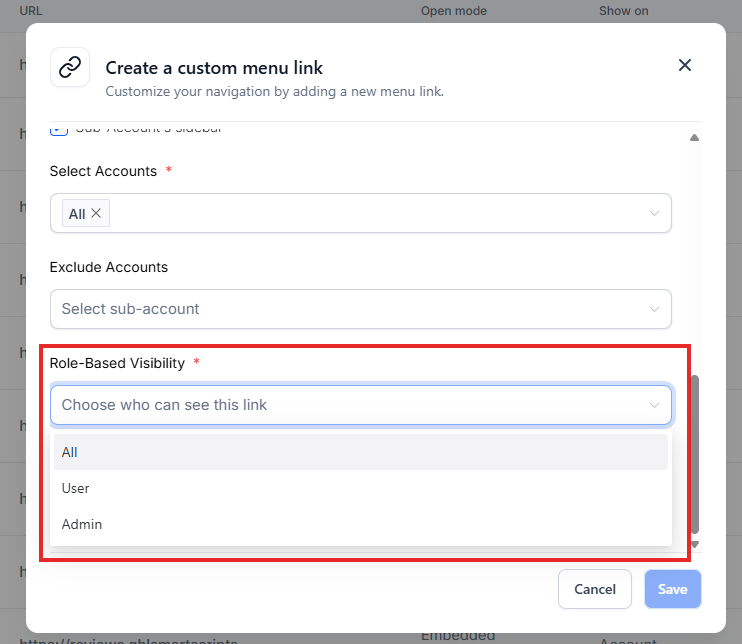 Restrict the Custom Menu Link based on the user roles within your sub-account.