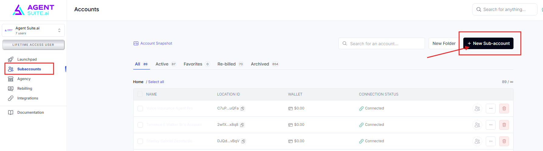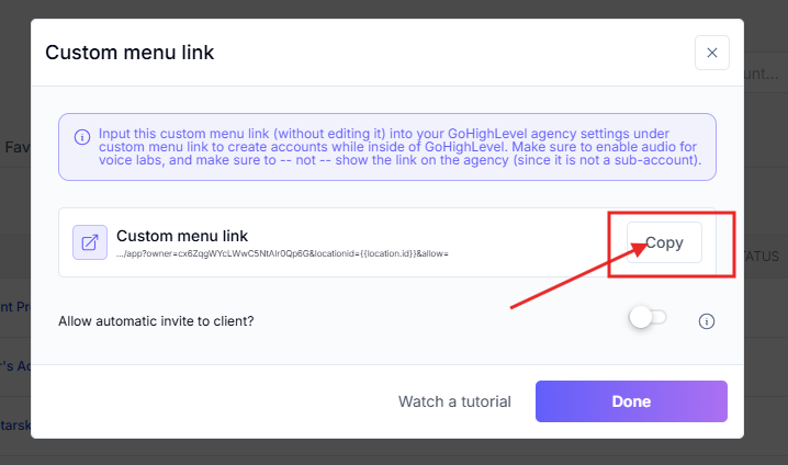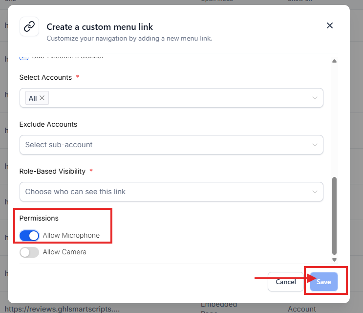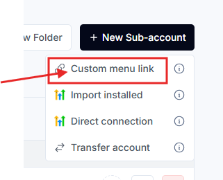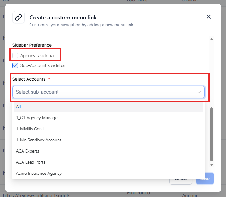Scroll down and de-select the Agency Sidebar if you prefer an uncluttered Agency View. This step is optional. Then, select which sub-account should gain access to your sub-account. Note that when a Custom Menu link is clicked for the first time within your sub-account, a new sub-account will automatically be created in the system and connected to the GHL sub-account.