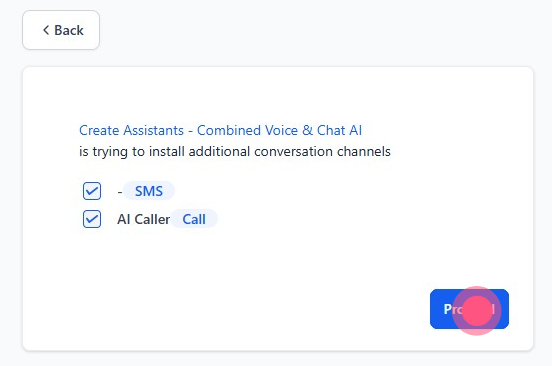 Select the two checkboxes (SMS and AI Caller) before clicking to proceed.