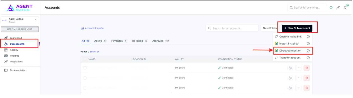 Go to Subaccounts. Click on New Sub-account then choose Direct Connection.