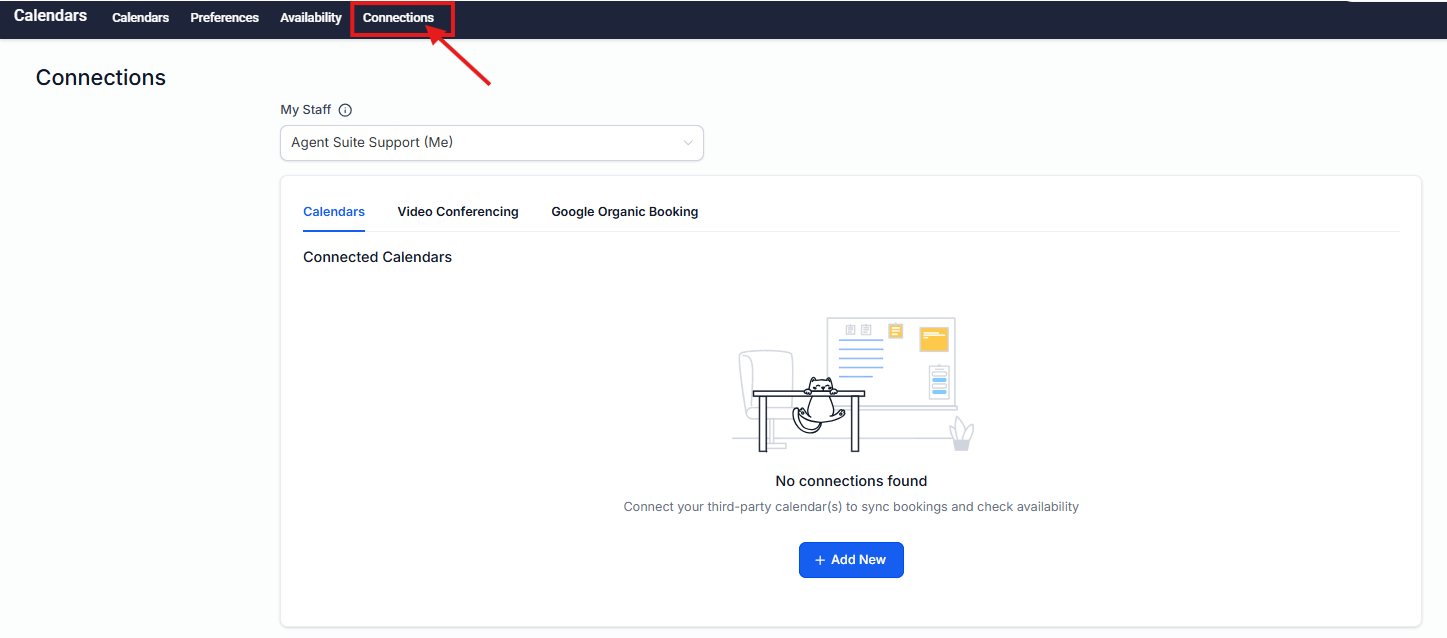 Select the Connections tab and click Add New to connect your personal calendar.