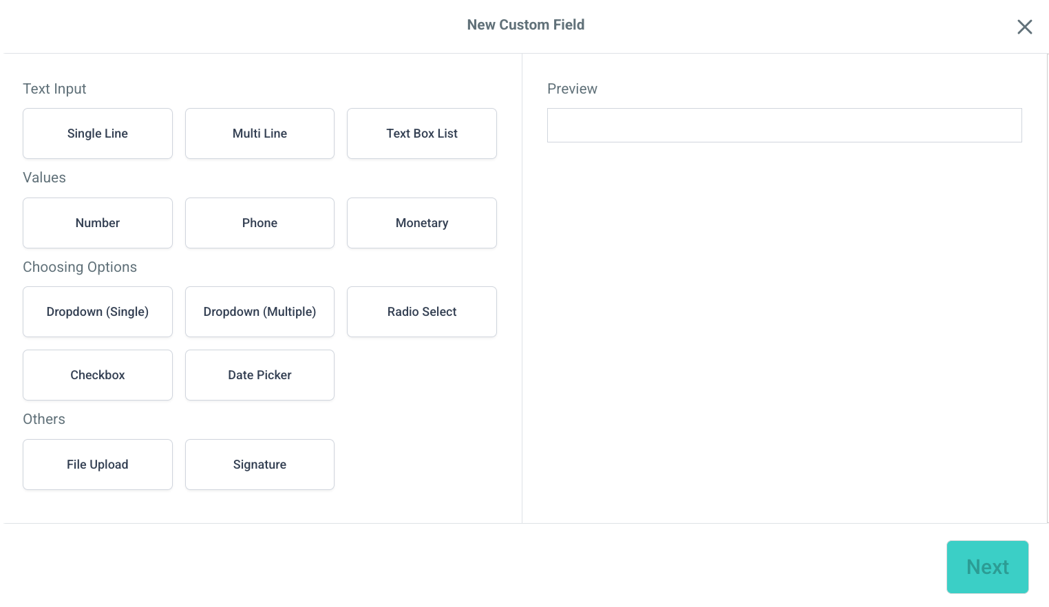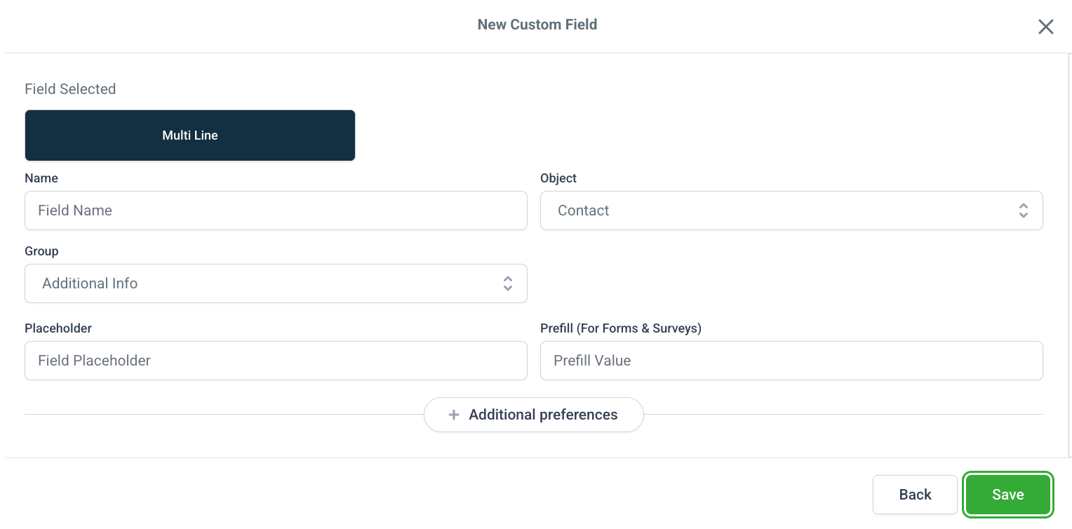Select the field type you want to create—such as Text, Dropdown, Radio, Date, etc. Then under the Object dropdown, Choose Contact if the field should appear in contact profiles. Choose Opportunity if the field should appear in opportunities only.