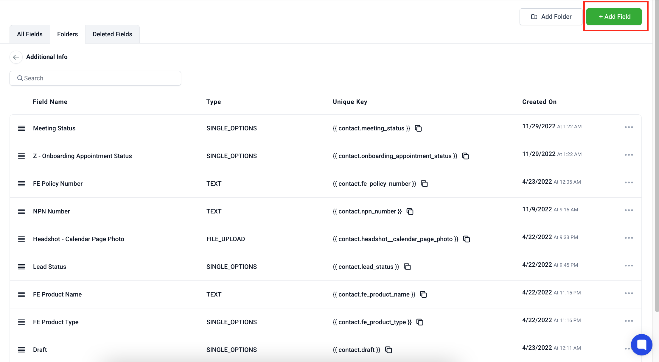 On the top-right of the Custom Fields screen, click the Add Field button to start creating a new custom field.