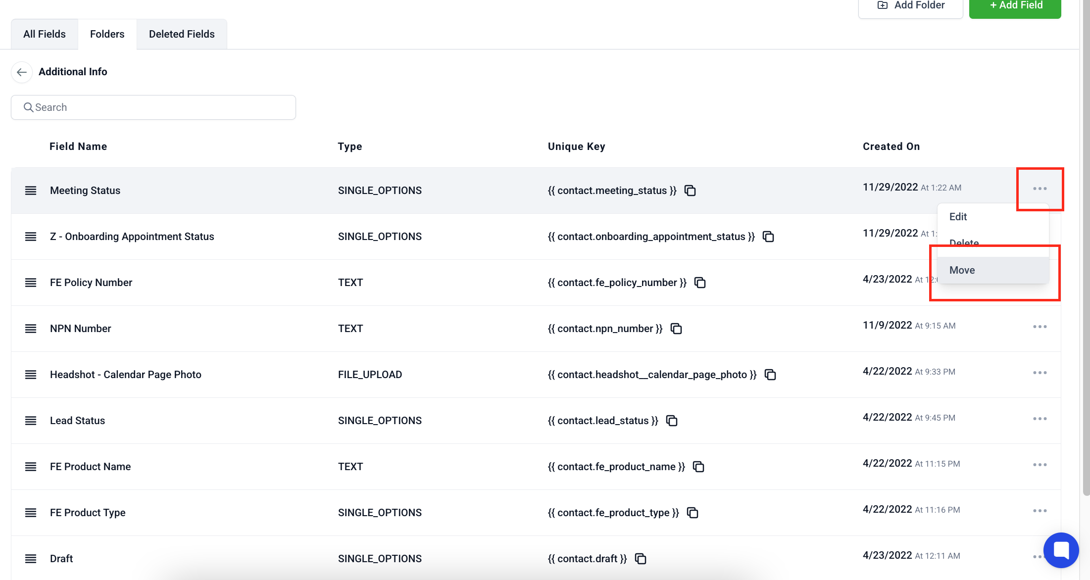 Step 3: Click the 3 dots on the farthest right of the field you want to Move. Then click Move.