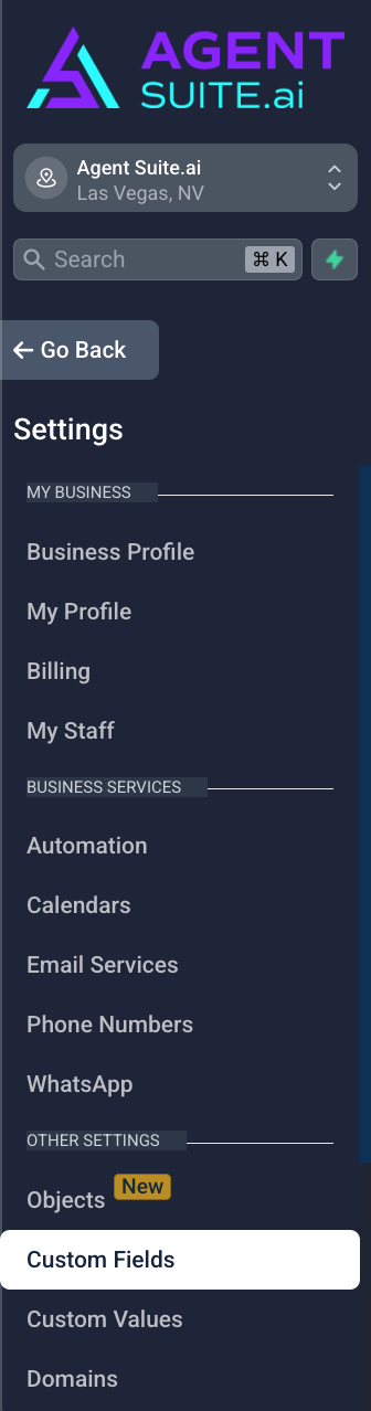 In your sub-account, click on Settings from the left menu, then scroll down and click Custom Fields. This is where you can view existing fields and create new ones for Contacts or Opportunities.