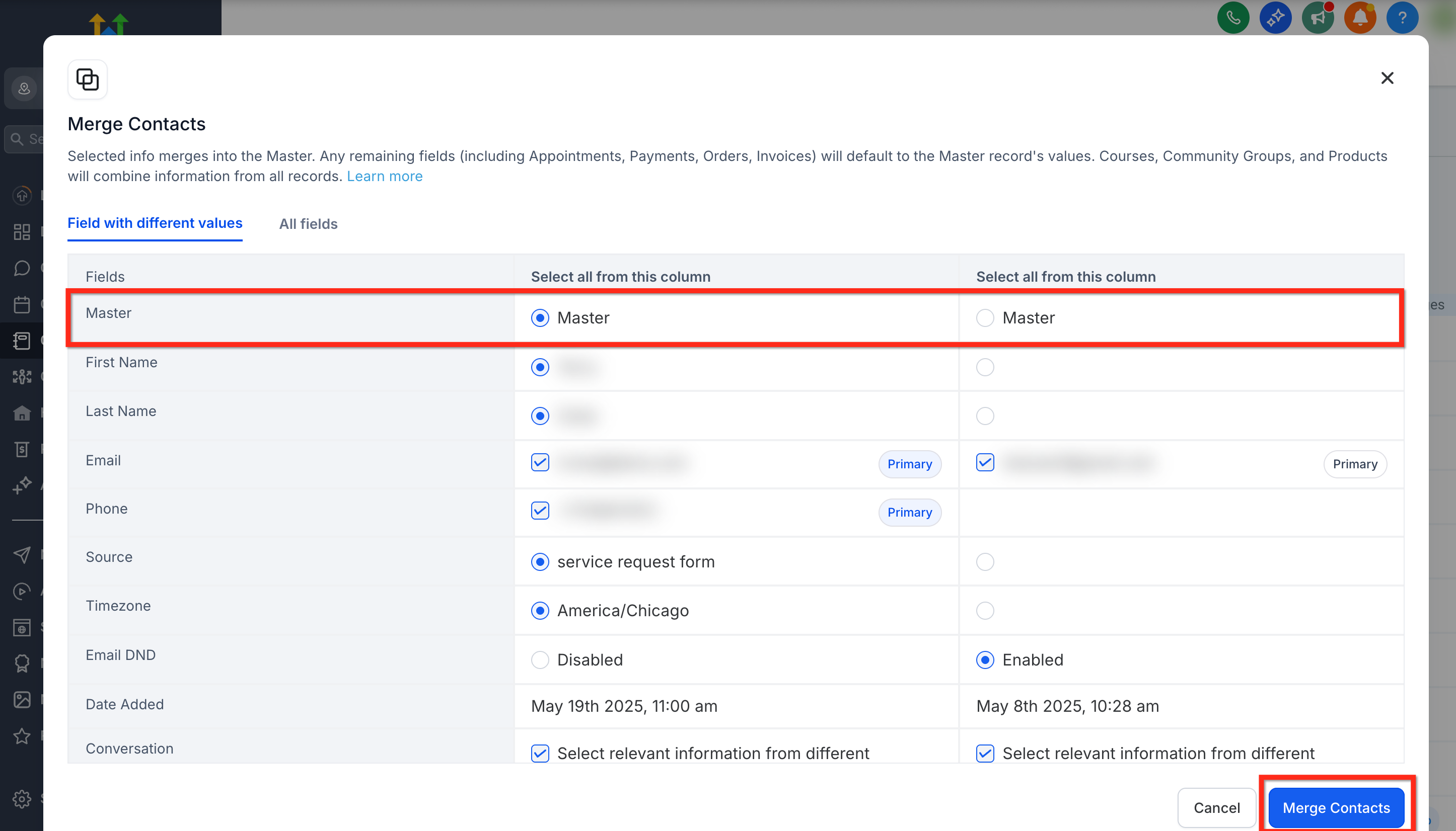 You can also select the Primary Email/Phone for the Master contact from any of the selected contacts.
