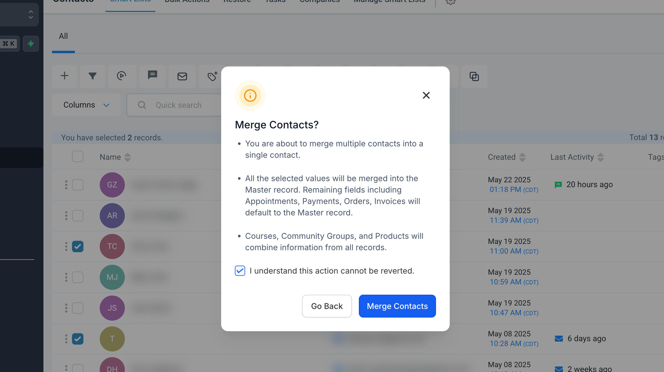 Merging duplicate contacts in HighLevel allows you to consolidate multiple records for the same individual or business into one unified contact. This helps reduce confusion, eliminate redundant communications, and ensure a clean contact database.