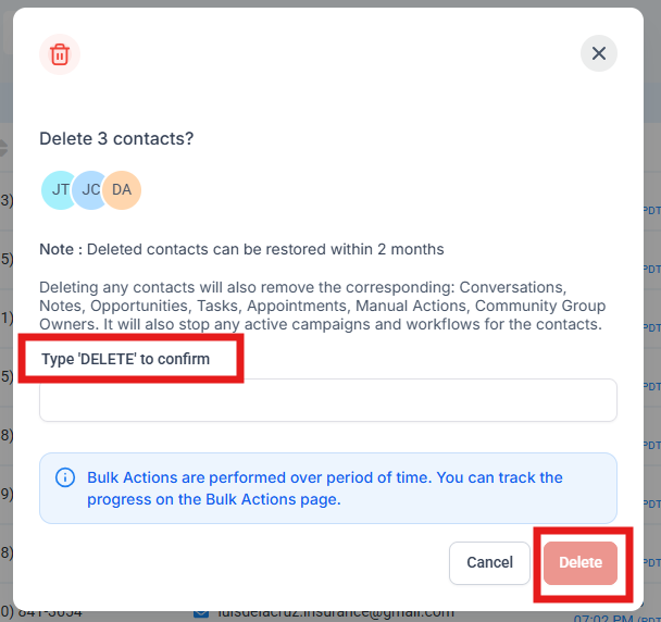 BEFORE DELETING A CONTACT: Once a contact is deleted, all associated data such as conversations, notes, tasks, and activity history is permanently lost. Restoring a deleted contact will not recover this associated data. Please ensure to back up any important information before proceeding with deletion.