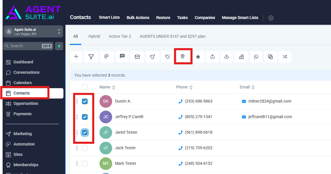 There are two different ways to select contacts. You can either select all contacts on a page (or all contacts in Agent Suite) by clicking the checkbox in the header of the contacts list, or you can select individual contacts by clicking the checkbox next to their name.