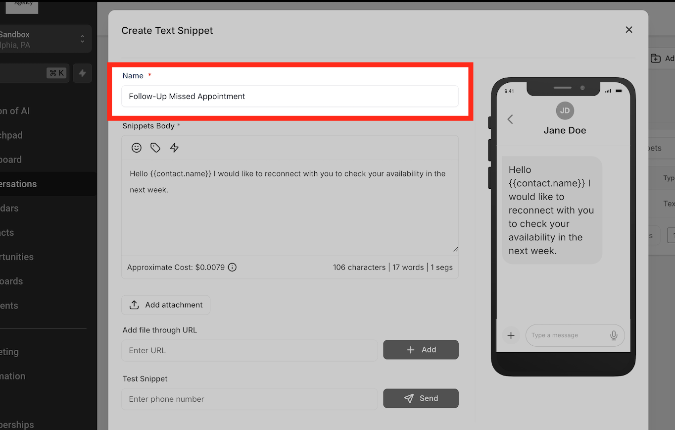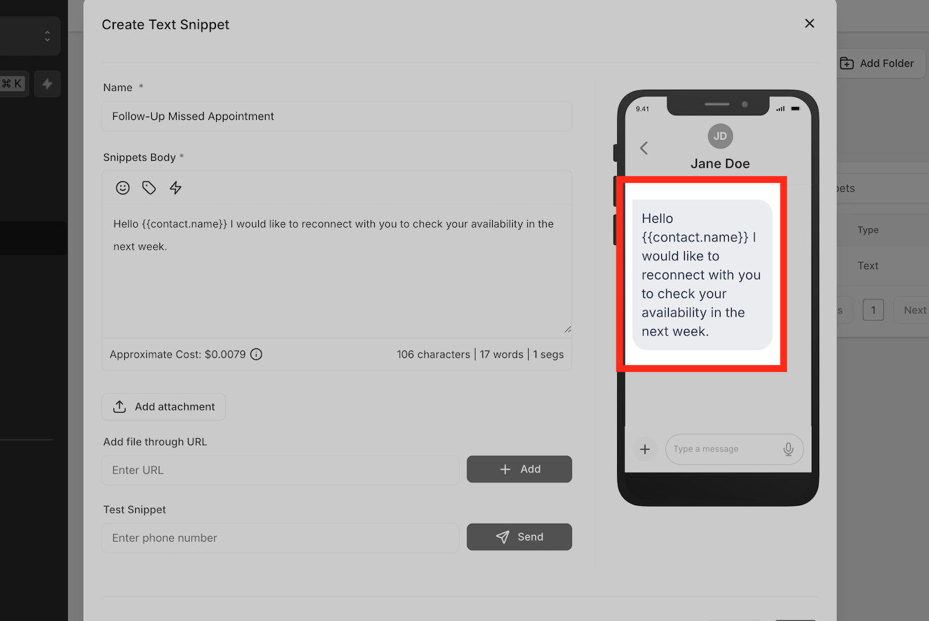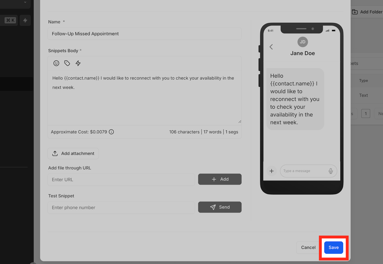 Name the snippet appropriately, such as “Follow-Up Missed Appointment” or “FAQ: Hours of Operation.”