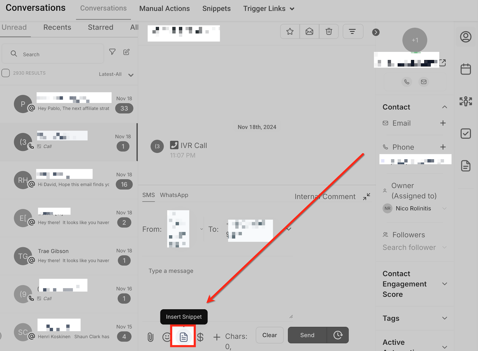 Open a conversation thread and click on the Snippets icon at the bottom.