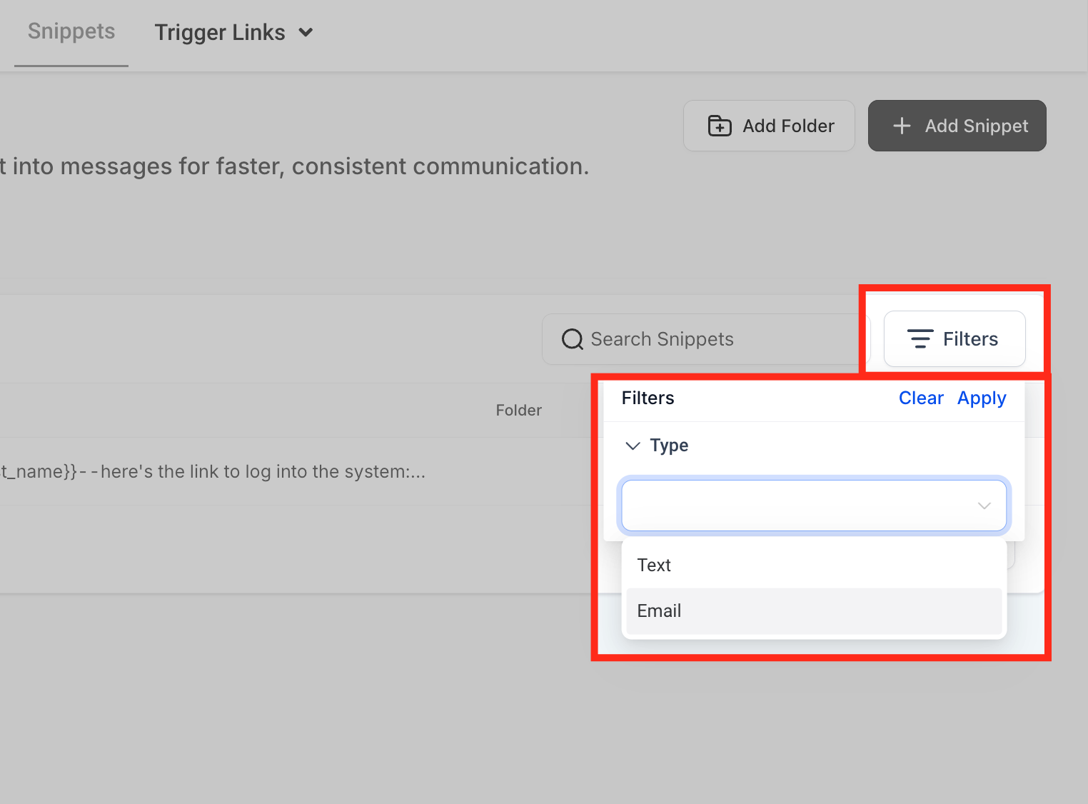 Quickly find snippets by typing a keyword or using filters (Text or Email) to narrow down the results.
