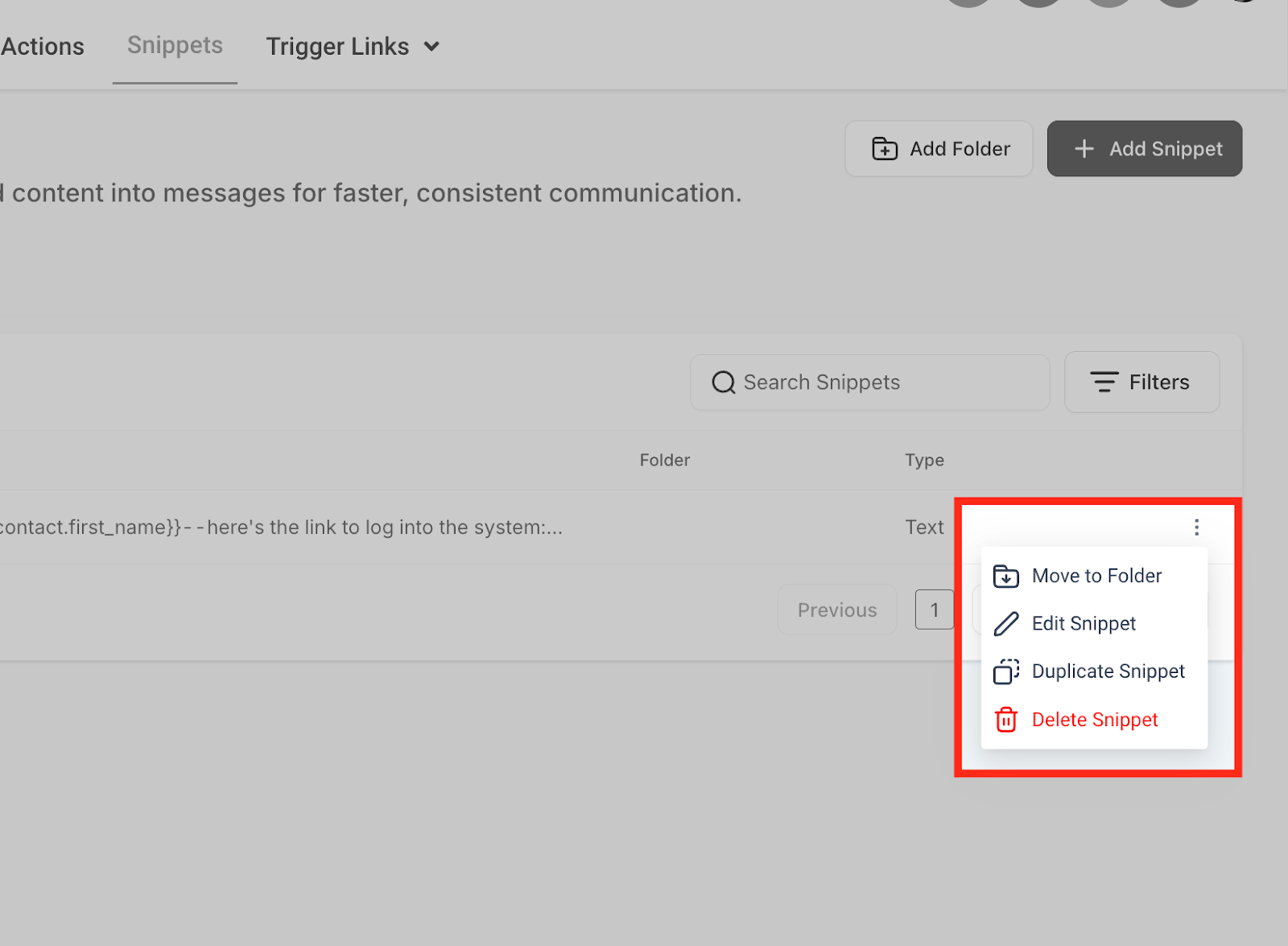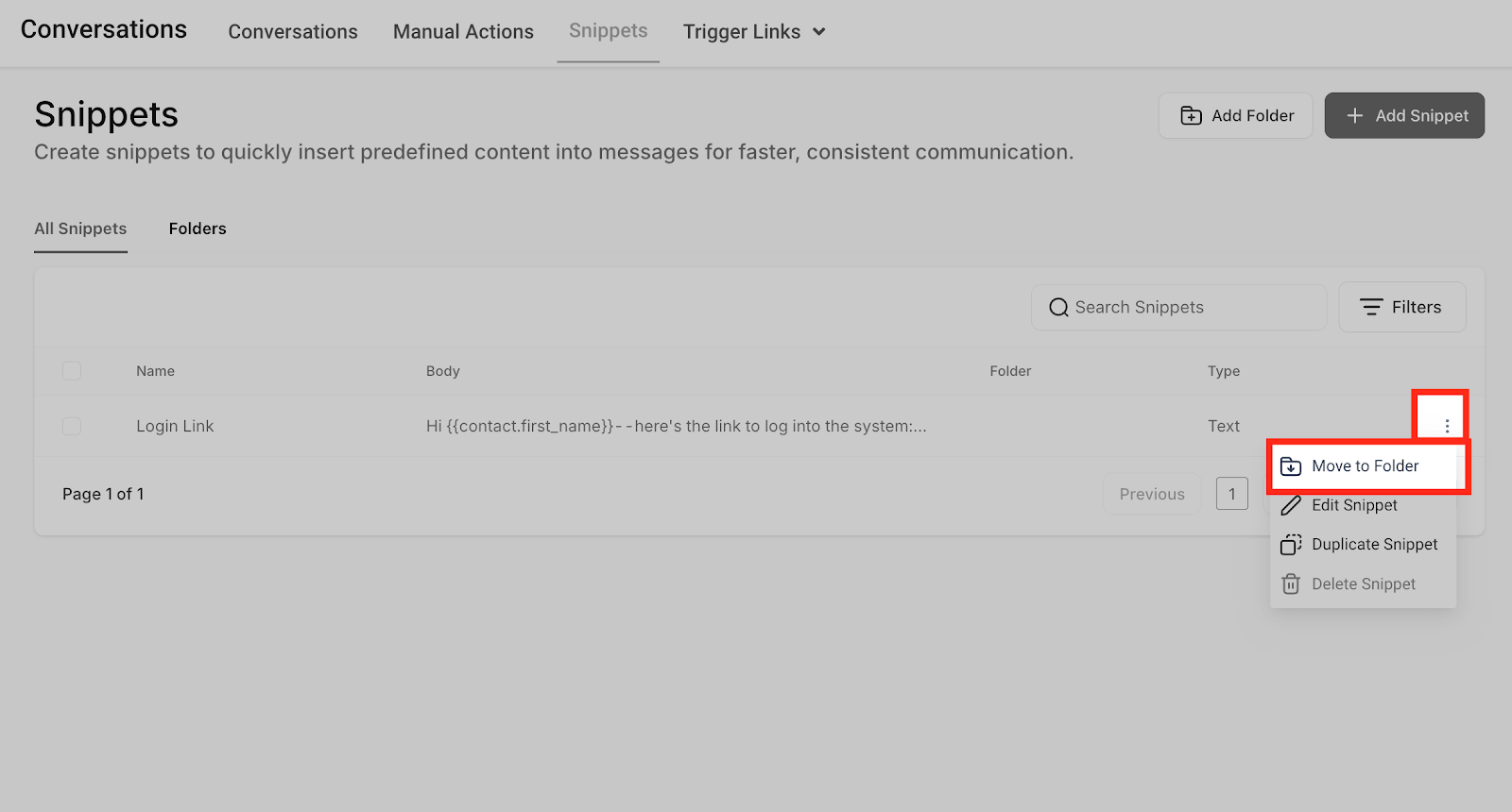 Assign snippets to folders by selecting a snippet, clicking the three-dot menu, and choosing Move to Folder.