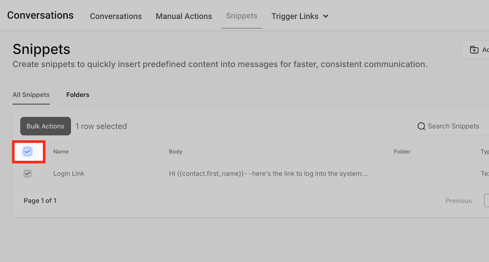 Navigate to Conversations on the left-hand menu. Select Snippets at the top of the screen.