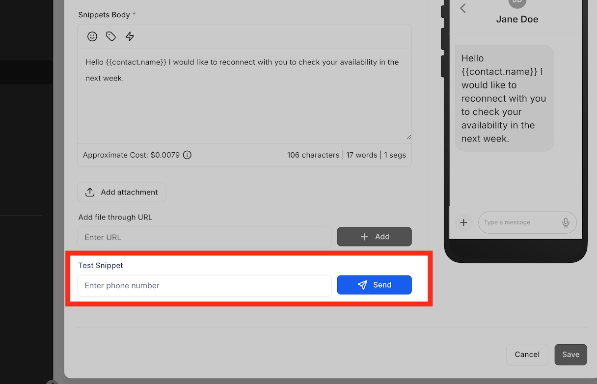Test the snipped by sending a sample to yourself (via SMS or email) if needed.