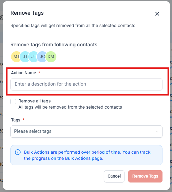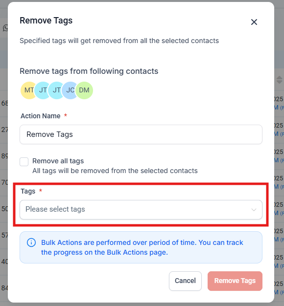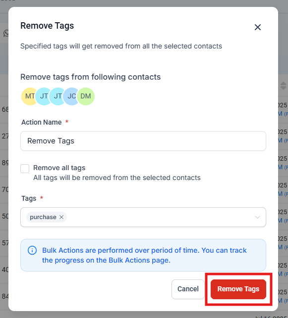 Removing tags in bulk allows you to clean up or reorganize contact data quickly. This is especially helpful when contact segmentation needs to be updated, campaigns have ended, or irrelevant tags are cluttering your CRM. Rather than editing each contact individually, bulk removal ensures swift and consistent updates.