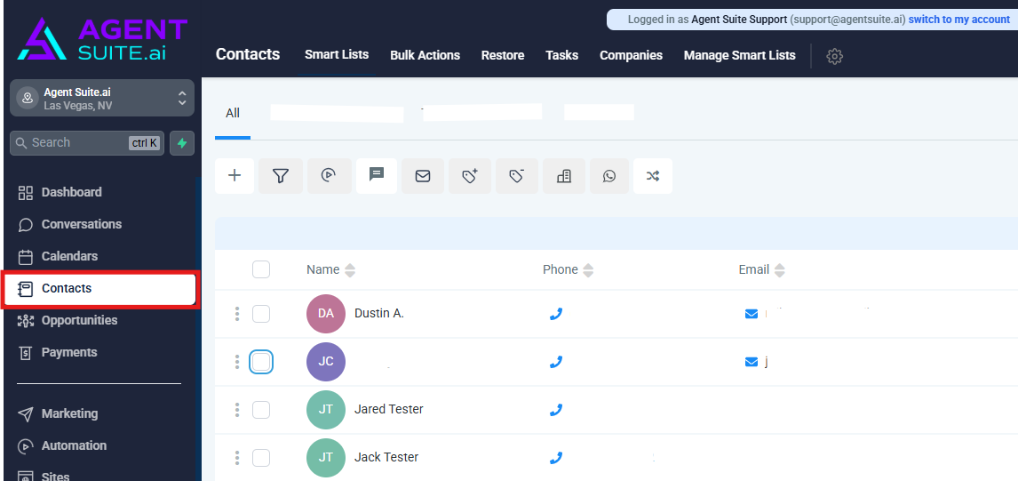 From the left-hand navigation menu in your dashboard, click on Contacts to access your contact list.