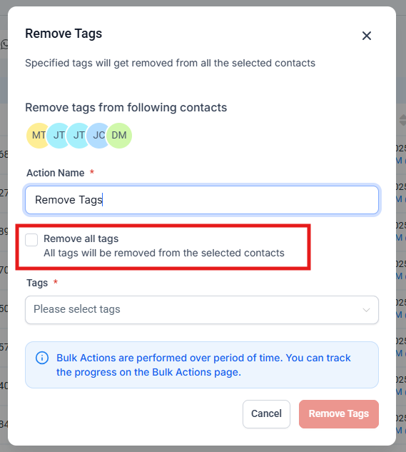 If you want to completely clear all tags from the selected contacts, check the Remove all tags box. This option removes every tag associated with those contacts—no need to specify which ones. It’s ideal for cleanup tasks or when you want to start fresh with a new tagging structure. Be sure you want to remove all tags before enabling this, as it clears everything in one go.