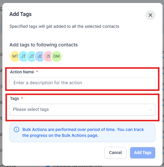 Adding tags in bulk allows you to label and organize large sets of contacts efficiently. Tags help categorize contacts based on shared traits, behaviors, or stages in the customer journey. This feature is essential for segmenting audiences, triggering automations, and managing CRM workflows at scale.