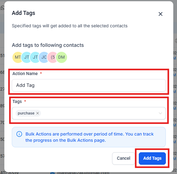 This confirmation popup appears right after clicking “Add Tags”. It informs you that the tag assignment is now in progress for the selected contacts. To monitor the operation, you can click the “Check Progress” button, which will redirect you to the Bulk Actions tab where you can track the success or failure of the task in real time